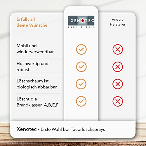 🔥 PREMIUM QUALITÄT: Du brauchst einen Feuerlöschspray, das mobil und wiederverwendbar ist und zudem alle Brände der Brandklassen A, B, E und F löscht, dann ist das hochwertige und robuste XENOTEC Löschspray genau das Richtige.