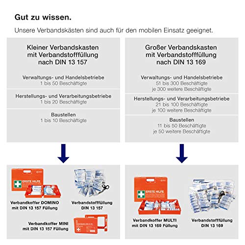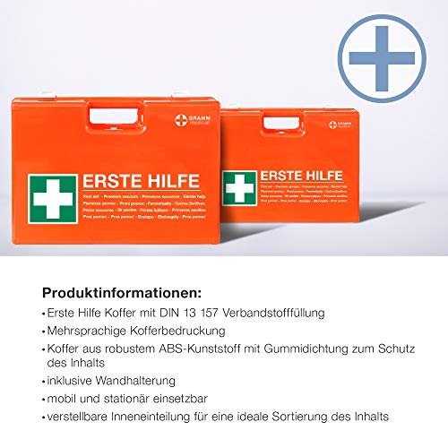 LIEFERUMFANG: 1x orangefarbener Erste-Hilfe-Kasten, 1x Wandhalterung, verstellbare Inneneinteilungen, verplompbarer Verschluss, ausgestattet nach DIN 13157:2021