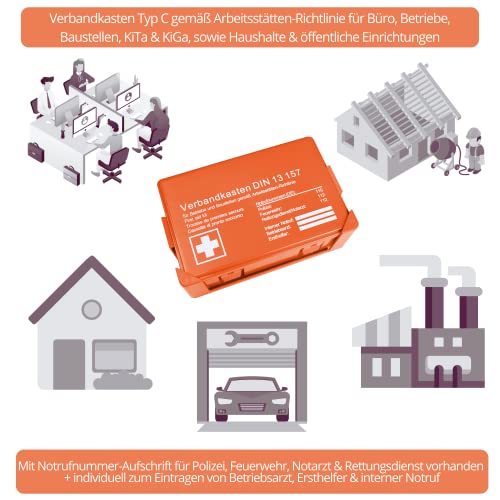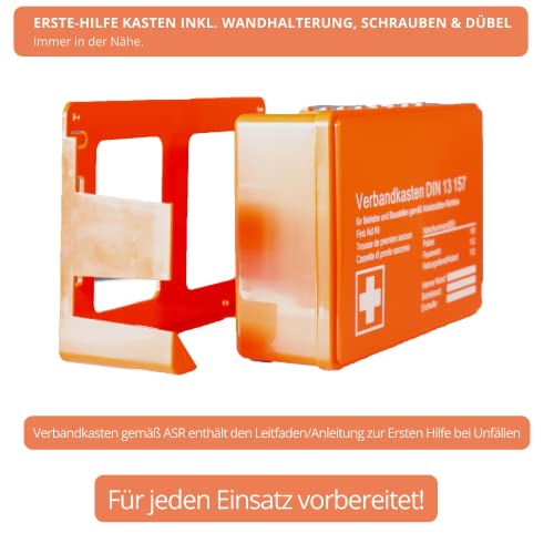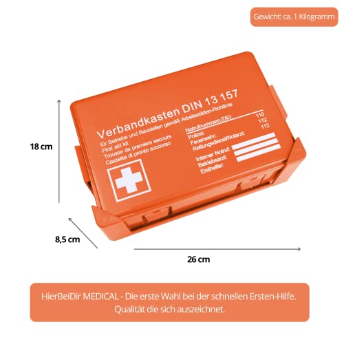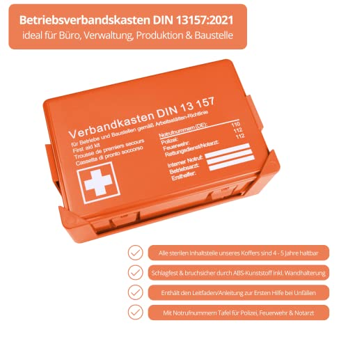 Specification: Betriebsverbandskasten DIN 13157:2021, Erste Hilfe Koffer mit Wandhalterung, Verbands-Kasten gemäß ASR, inkl. Notrufnummer, HierBeiDir