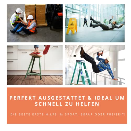 LIEFERUMFANG: Gefüllt mit Verbandsmaterial DIN 13157:2021 bestehend aus 71 Teilen, enthält den Leitfaden/Anleitung zur Ersten Hilfe bei Unfällen