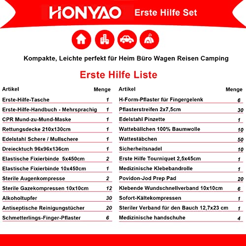 Specification: HONYAO Erste Hilfe Set, 220 Stück Kompakt First Aid Kit mit Premium-Tasche für Notfälle in Zuhause Auto Arbeitsplatz Familie Motorrad Reise Camping Wandern Draussen Sport