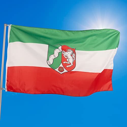 FLAGGE ZEIGEN: Klassische Nordrhein-Westfahlen Fahne aus wind- und wetterfestem Material – dank der integrierten Ösen einfach am Fahnenmast oder am Balkon zu befestigen