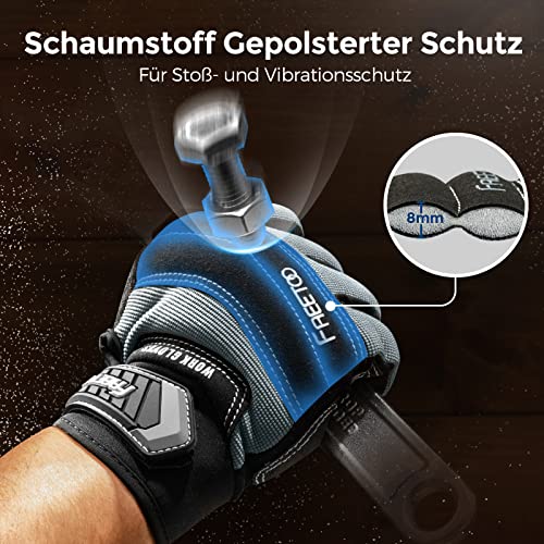 [Leistungsstarker Handflächen- und Knöchelschutz]: FREETOO Mechaniker-Arbeitshandschuhe wurden mit Kunstlederhandfläche und 8 mm gepolsterten Knöcheln entwickelt, um Ihren vollen Händen maximalen Schutz vor Stößen oder Blasen zu bieten. 2 mm Verbundschwammmaterial auf der Rückseite der Mechanikerhandschuhe für hervorragenden Aufprallschutz. Ihre Hände sind immer gut geschützt.