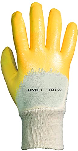 Eigenschaften der Arbeitshandschuhe Nitril 3/4 beschichtet, Trägermaterial: Dünner Baumwoll-Liner, Standard Qualität, Beschichtung Nitril, Farbe Natur / Gelb
