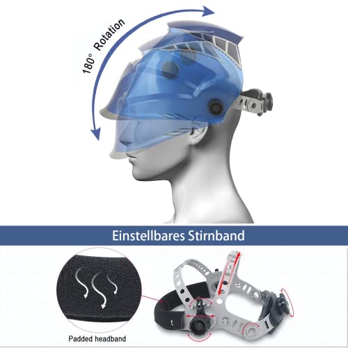 Manuelle Anpassung: Ausgestattet mit Empfindlichkeits- und Verzögerungseinstellungen zur Anpassung an unterschiedliche Umgebungen und Aufgabendauern; genießen Sie eine bessere Sichtbarkeit und Farberkennung. Die Maske verfügt über 16 UV/IR-Schutzstufen mit stufenlosen Einstellungen von DIN 5-9,9-13 einstellbar(Dunkelzustand) und DIN4 (Hellzustand), die Strahlung stark filtern und die Augen effektiv schützen können.
