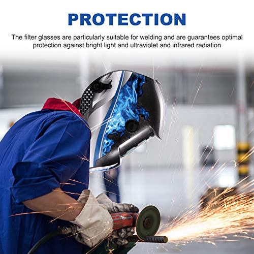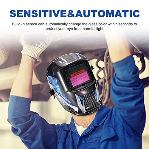 [SENSIBEL UND AUTOMATISCH]: Der Schweißhelm eingebaute Sensor kann die Glasfarbe innerhalb von Sekunden automatisch ändern, Dual-Filter, schädlicher, ultravioletter und infraroter Strahlung zur Vermeidung, welche durch den Lichtbogen erzeugt wird und dadurch eine Schädigung der Augen durch das Schweißlicht verursachen könnte.