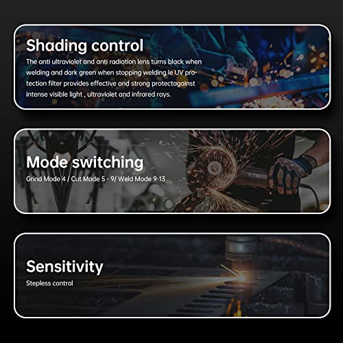 Manuelle Anpassung erfüllt verschiedene Anforderungen: Ausgestattet mit Empfindlichkeits- und Verzögerungseinstellungen für Anpassungsfähigkeit für verschiedene Umgebungen und Aufgabendauer; Genießen Sie verbesserte Sichtbarkeit und Farberkennung. Der Lichtgrad des Filters ist DIN4 und die Zeit von dunkel bis hell innerhalb von 0,1 s bis 1,0 s