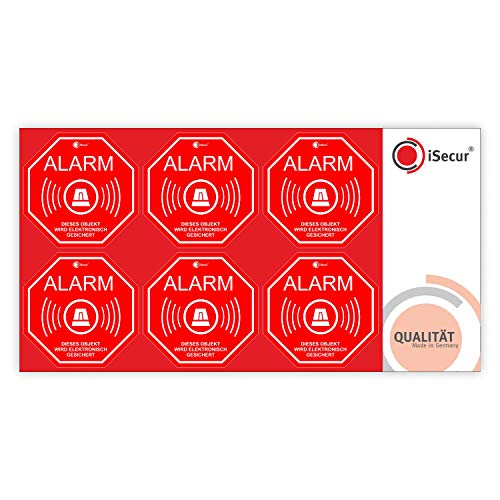 Specification: 6er Alarm-Aufkleber-Set I hin_166 5×5 cm I Achtung Gebäude, Objekt ist elektronisch Alarm-gesichert I für Fenster-Scheibe, Tür I innenklebend wetterfest