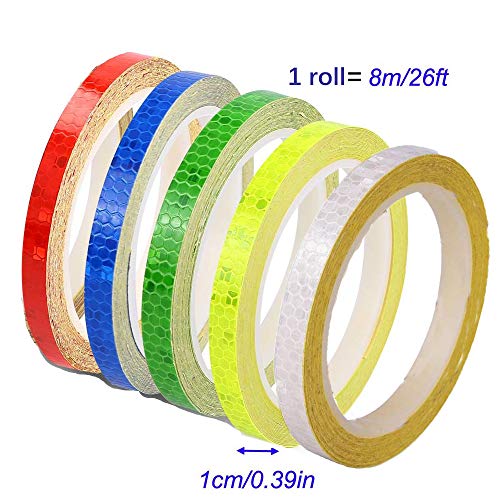 Es gibt 5 Stück reflektierende Klebeband-Aufkleber, 10 mm x 8 m pro Rolle, 5 Farben mit rot, weiß, gelb, blau, grün, erfüllen mehr Ihre Bedürfnisse.