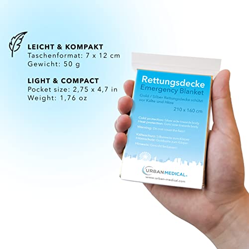 Specification: URBAN MEDICAL Premium Rettungsdecken | Schutz vor Kälte und Hitze | 5-15 Stück | Doppelseitige Notfalldecken – Gold/Silber | Große Rettungsfolien für Erste Hilfe | 210 x 160 cm