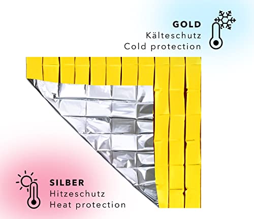 ✅ ERSTE HILFE UND NOTFÄLLE – Die Rettungsdecken sind perfekt dazu geeignet vor dem Auskühlen (Silberseite zum Körper) und vor Hitze durch Sonneneinstrahlung (Goldseite zum Körper) zu schützen