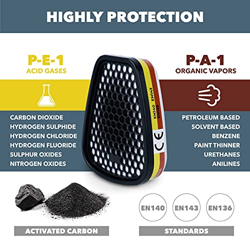 HÖHERER SCHUTZ: Unsere Kartuschen sind P-A-1 (für organische Dämpfe und andere übliche Gase) und P-E-1 (saure Gase). Zusammen mit Aktivkohlefiltern und -patronen bieten sie einen besseren Schutz als andere Atemschutzmasken (die nur P-A-1 sind). Sie können auch Zentralpatronen einbauen, wenn Sie die Zentralschraubkappe entfernen.